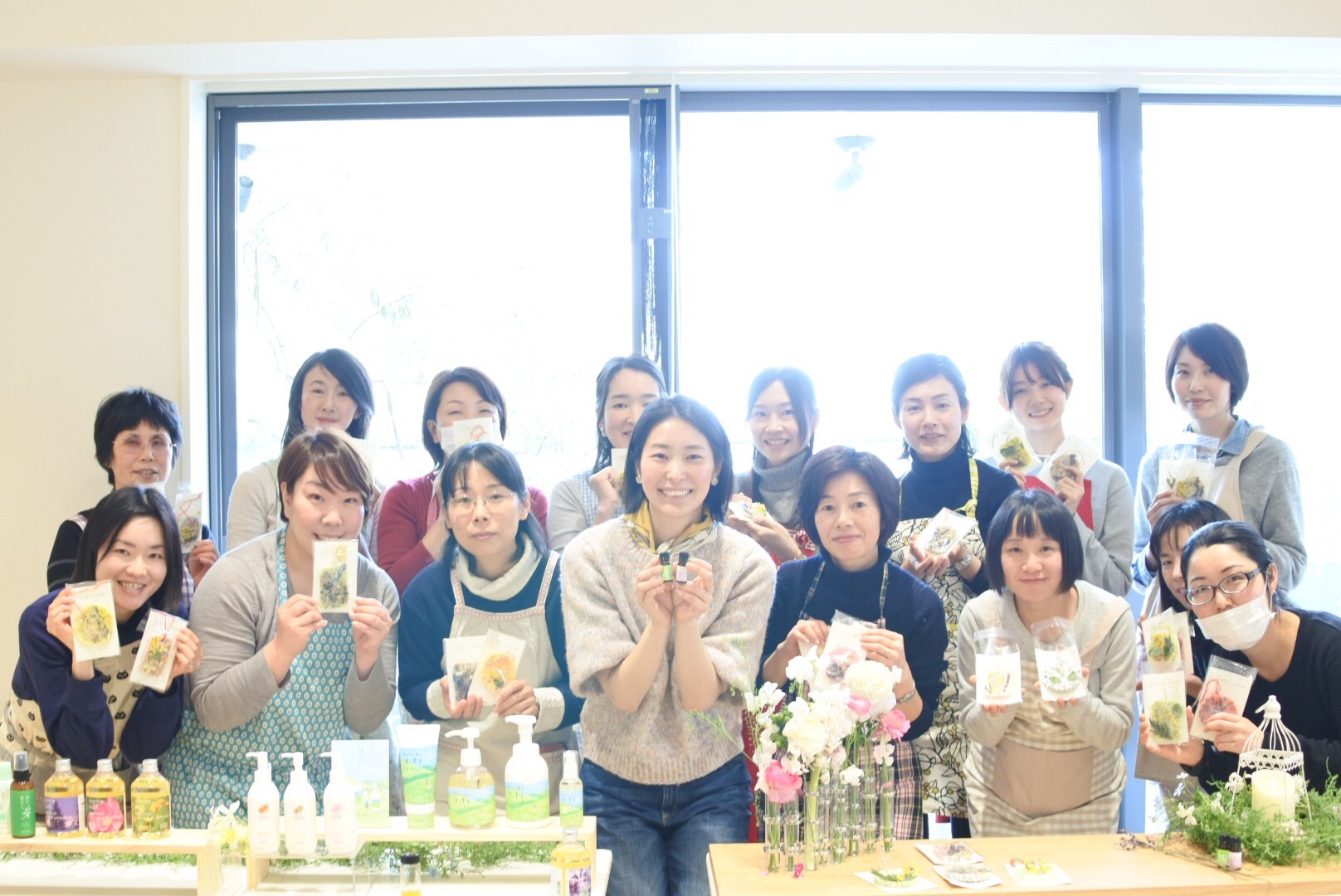ひと足早い春色のお花と優しい精油の香りにつつまれた居心地のよいワークショップでした。