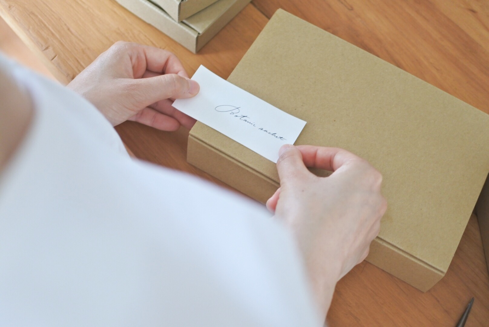 そしてロゴのシールを左下に貼って完成です。開けた瞬間にもれる香りを感じてほしい(嗅覚)という想いからboxはできるだけシンプル(視覚)に。ご購入いただいた方からのDMで、箱を開けた瞬間にいい香りがしましたというメッセージも実は多いんです。
